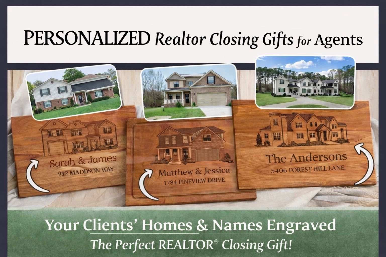 A premium, personalized closing gift that turns your client’s home into a custom engraved keepsake. Using a photo of the property, we create a detailed wood engraving with the homeowner’s names and address, giving agents a memorable way to celebrate the closing and stay top of mind long after move in day.